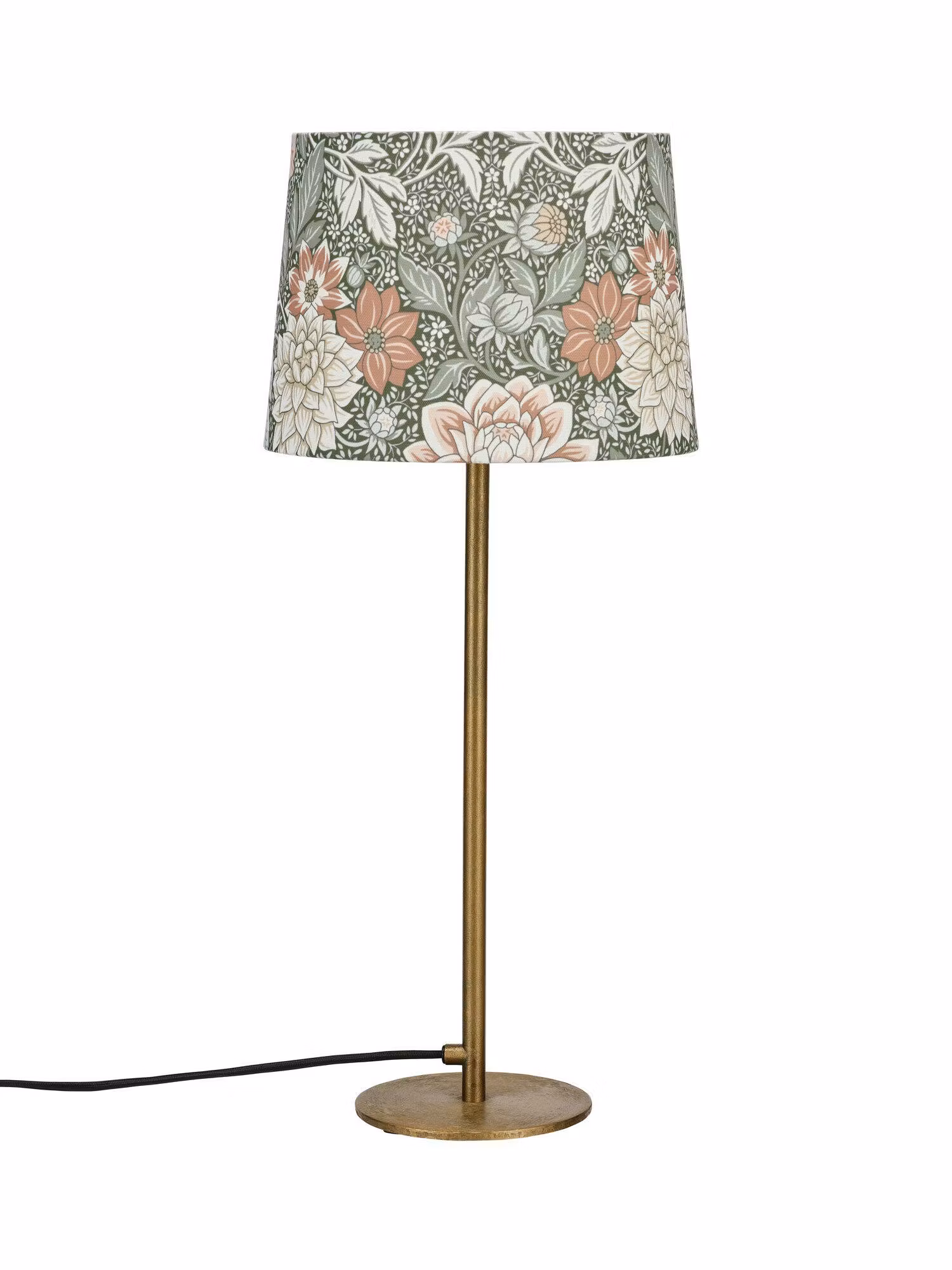 Lampfot av metall, i en enkel och stilren design med lampskärm Dahlia Garden i grön/mildrosa färgställning. Handmålat mönster av designern Jenny Hahne Gadd för Boråstapeter. Låt de praktfulla dahliorna och sirliga bladen flytta in i ditt rum. Skärmens mått: 25 cm diameter i botten, 22 cm i toppen och 18 cm hög. E27 fäste 4,5cm från botten. 2 meter lång textilsladd med strömbrytare ca 30 cm från lampan. E27 sockel, max 40W. IP20. Lampfoten är 45 cm hög och 14 cm bred.