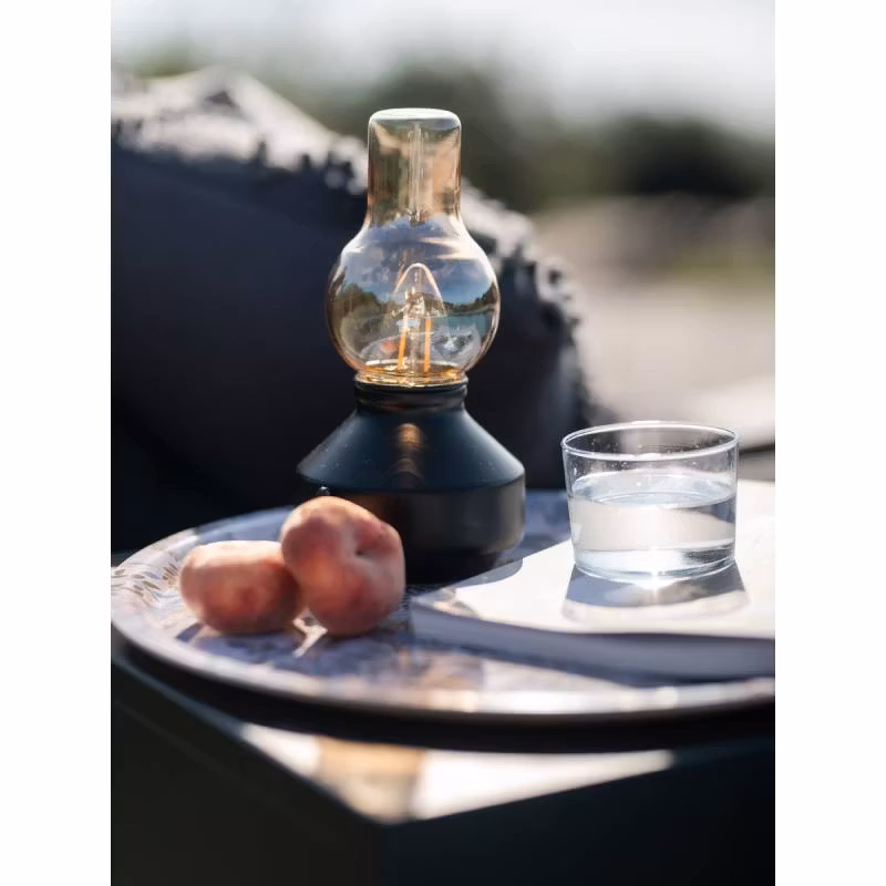 Populär laddningsbar bordslampa nu i utförande som tål utomhusbruk och som kan dimras steglöst, designad i klassiskt formspråk som påminner om den gamla oljelampa vi hade en gång i tiden fast i ny och modern tappning. Lampan är gjord i metall och glas samt drivs av ett litiumjon batteri som är uppladdningsbart via USB C uttag. Laddkabeln (1m) ingår såklart. Ljuskällan är inte utbytbar. Ljusflödet varieras 20-40 lumen beroende på dimringsnivån och ger en behaglig färgtemperatur runt 2000 kelvin. Det tar ca 4 timmar för lampan att laddas upp från noll batterinivå. Vid svagast ljusnivå kan lampan vara tänd upptill 8 timmar. Laddningscykler, 400 gånger. Dimension, Φ11x21cm. IP44.
