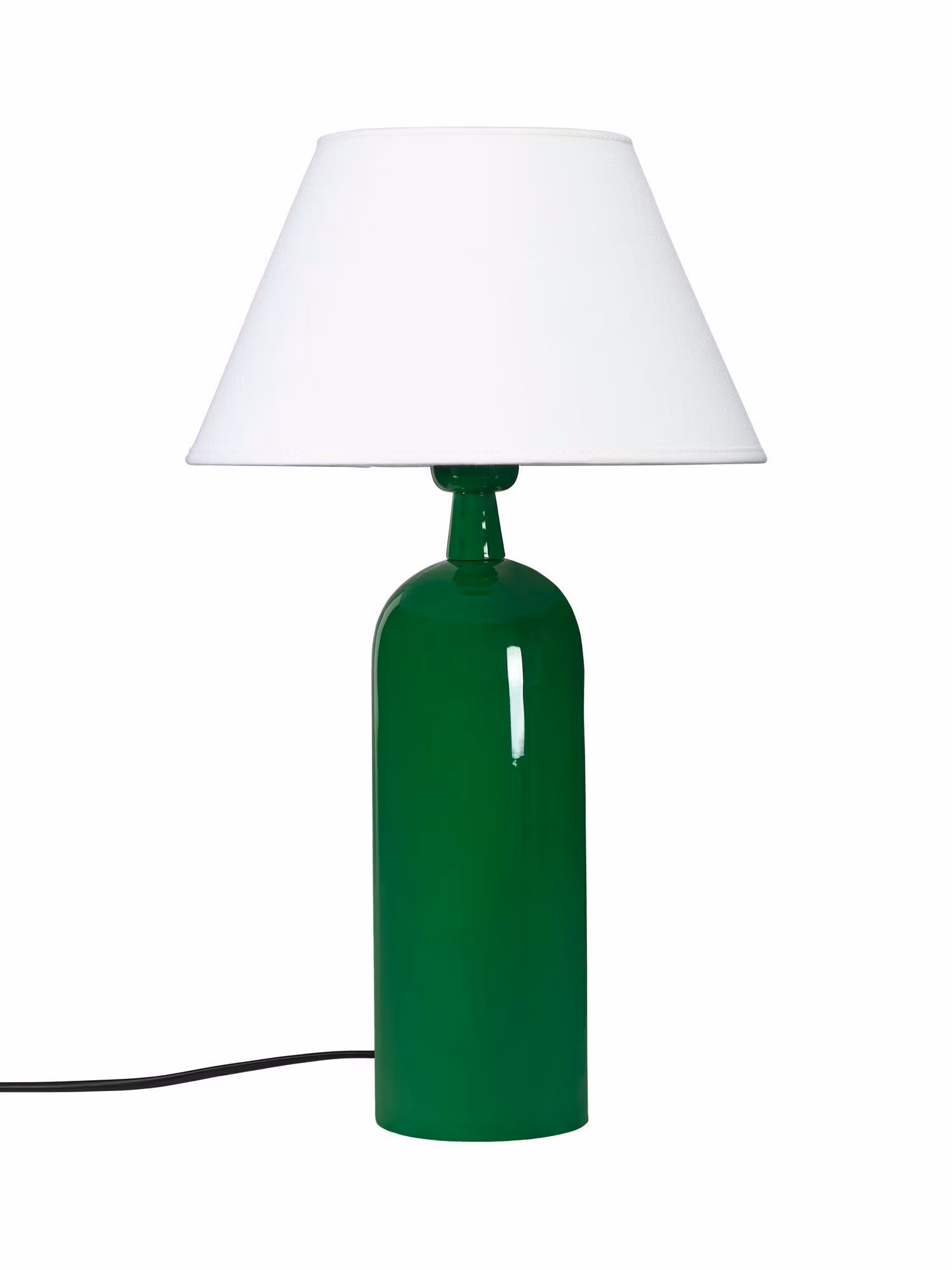 En lättplacerad, stilren bordslampa som avger ett mjukt och behagligt sken i det rum du väljer att placera den i. Lampfoten är i metall och har en högblank grön finish. Skärmen har en klassisk konisk form. Svart plast sladd 170cm med strömbrytare ca 45cm från lampan.