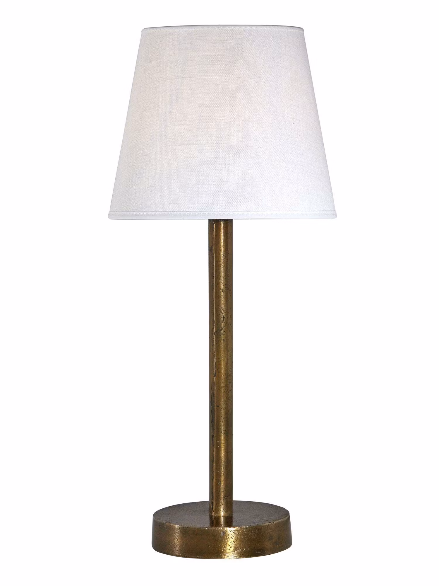 Columbus lampfot i råmässing med lampskärmen Mia lin i färgen offwhite. Skärmen är 20 cm bred och 17 cm hög och har ett klofäste. Lampfoten är 35 cm hög och den totala höjden blir 46 cm. Ljuskälla ingår ej.