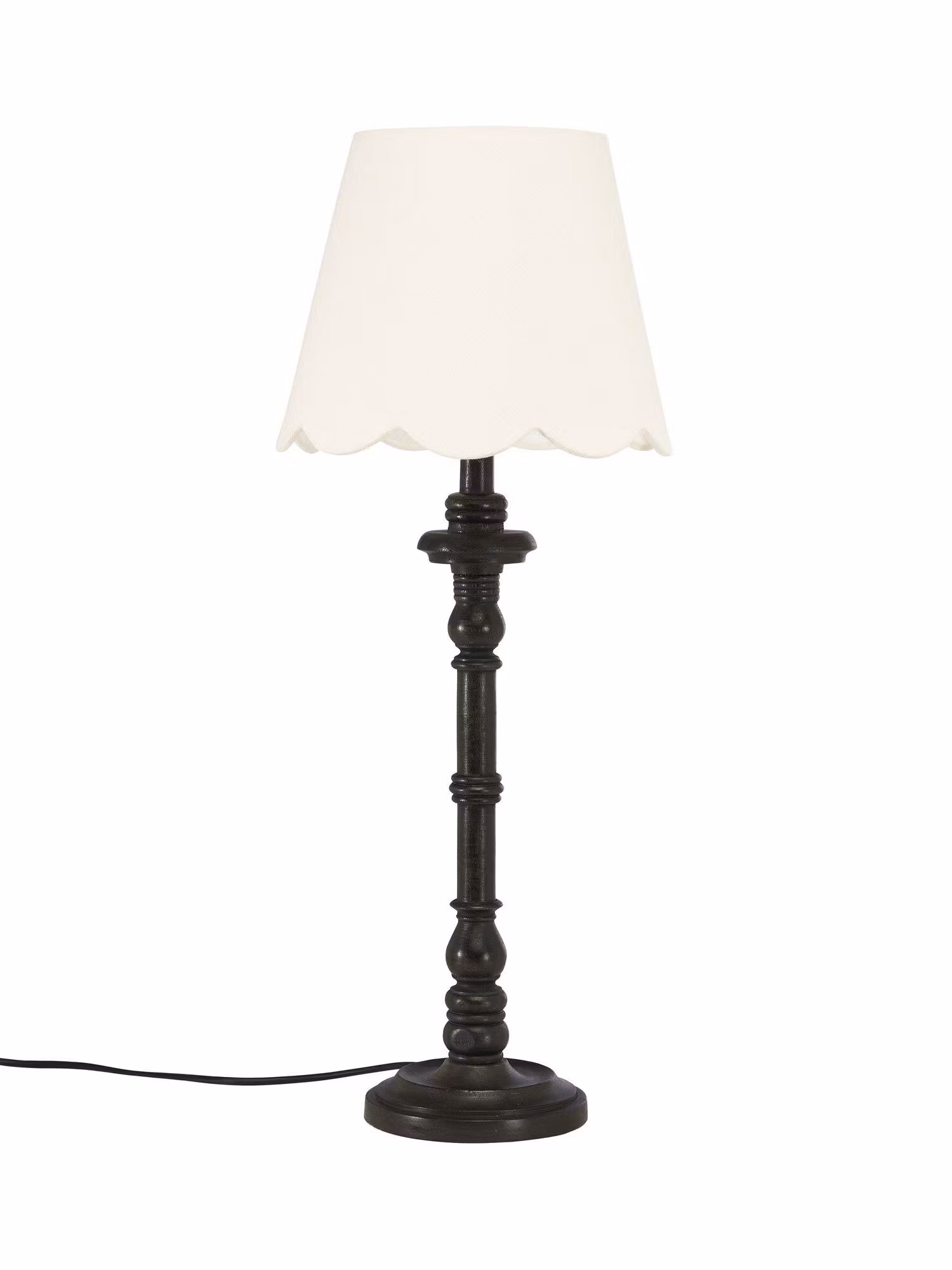 En dekorativ bordslampa inspirerad av gamla ljusstakar. Lampfoten har en svartbrun finish med naturliga skiftningar som gör varje lampa unik. Skärmen är i linnetyg med fin struktur, lätt utställd och har en vågig form nedtill. 1,8m svart plastsladd med strömbrytare, E27 lamphållare.