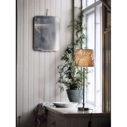 En klassisk och lättplacerad lampfot i krom med lampskärm Dahlia Garden i grön/mildrosa färgställning. Ett handmålat mönster av designern Jenny Hahne Gadd för Boråstapeter. Låt de praktfulla dahliorna och sirliga bladen flytta in i ditt rum. Lampfoten är 46 cm hög och har en 1,5 m sladd i plast med strömbrytare ca 30 cm från lampan. E27 sockel, max 40W. IP20. Skärmens mått: 20 cm diameter i botten, 17 cm i toppen och 15 cm hög. E27 ringfäste. Gjord i 100% återvunnen polyester, tryckt i Borås.