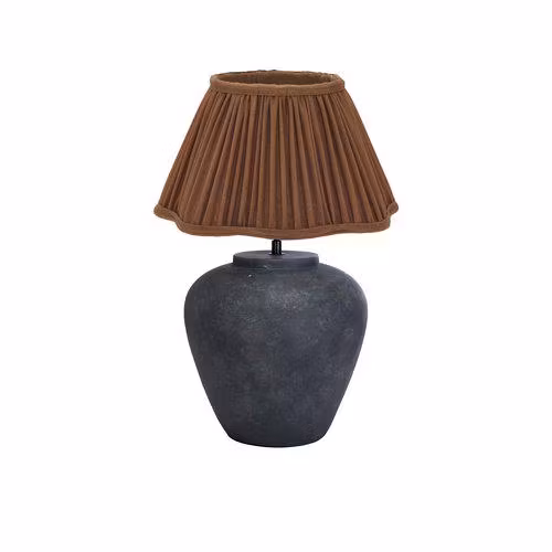 Bordslampa Lilly i keramik med Sonja lampskärm i cognacsbrun sidenlook, total höjd 41cm.Lampfoten är handgjord och designad med en vacker urnform. Vintage finishen gör att varje lampa blir unik och gör att just din lampa kan avvika något från produktbilden. Svart sladd med strömbrytare och väggkontakt. E27 lamphållare. Lamphuvud är ledad för horisontell justering av lampskärmen. Max 40W. IP20. Höjd 29cm, diameter 19cm. Sonja lampskärm med rynkat tyg i sidenlook och är fodrad med bomullstyg i samma färg. Skärmen har en vågig form nedtill som skapar ett fint flöde av ljuskällan. Skärmen har ett E27 ringfäste. Diam. 30cm, höjd 17,5cm. Ljuskälla ingår ej.