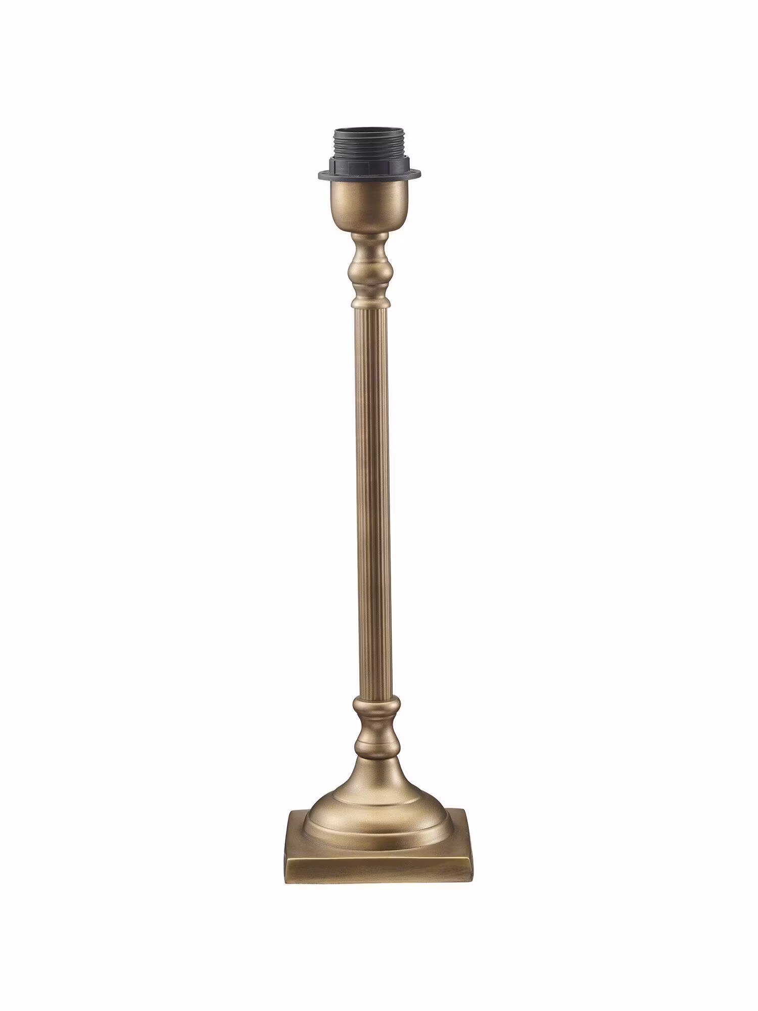 Lampfot Margot, en klassisk och stilren lampfot i metall med fina detaljer. Antikmässing finish. Höjd 41cm, bredd 10,5cm och djup 10,5cm. E27. Max 40W. IP20. 1,6m svart plastsladd med strömbrytare. Passar lika bra med en enkel och enfärgad lampskärm som med en mönstrad färgstark lampskärm i diam upp till 20cm. Ljuskälla ingår ej.