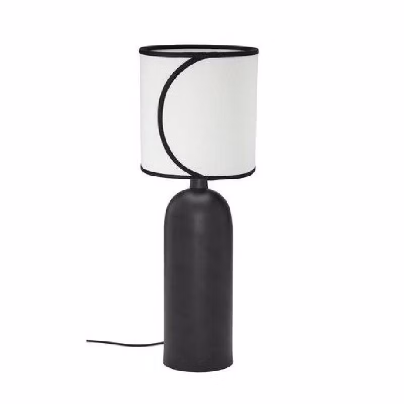 Riley lampfot i svart hamrad metall med lampskärmen Celyn Ava i offwhite/svart. Skärmen är 20 cm bred och 22 cm hög med E27 ringfäste. Lampfoten är 28 cm och har en svart plast sladd 170 cm med strömbrytare. Total höjd blir 45 cm. E27 sockel. Max 40W. Ljuskälla ingår ej.