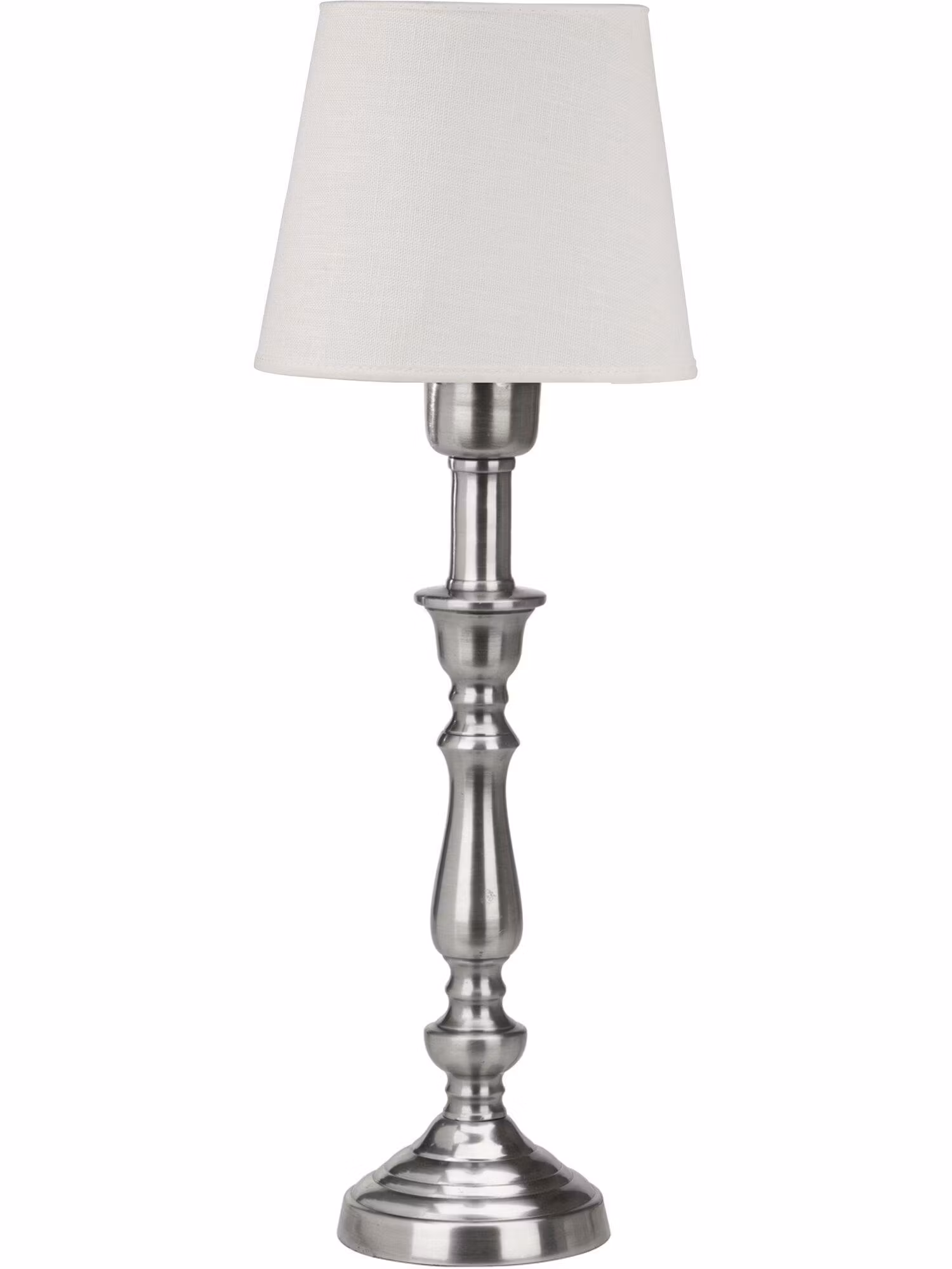 Therese lampfot i antiksilver med lampskärmen Mia i ett offwhite linnetyg. Skärmen är 17 cm bred och 14,5 cm hög och har ett klofäste. Lampfoten är 34 cm hög och den totala höjden blir 43 cm. E27 sockel. Max 40W. Ljuskälla ingår ej.