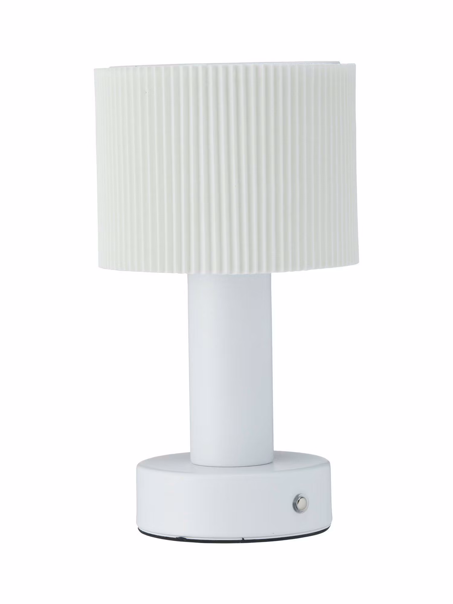 Laddningsbar bordslampa med tre förinställda färgtemperaturer 2700-4000-6500K. Stommen är gjord i lackerad metall. Lampskärmen är gjord i plisserad bommull. Lampan drivs av ett litiumjon batteri som är uppladdningsbart via USB C uttag. Laddkabeln (1m) ingår. Ljuskällan är inte utbytbar. Ljusflödet varieras 20-40 lumen. Det tar ca 6 timmar för lampan att laddas upp från noll batterinivå. Vid svagast ljusnivå kan lampan vara tänd upptill 8 timmar. Tänd eller släck lampan genom att hålla i ON/OFF knappen i 3 sekunder. Färgtemperaturer ställs in med snabbt tryck på samma knapp. Laddningscykler, 400 gånger. Dimension, ?13x24cm.
