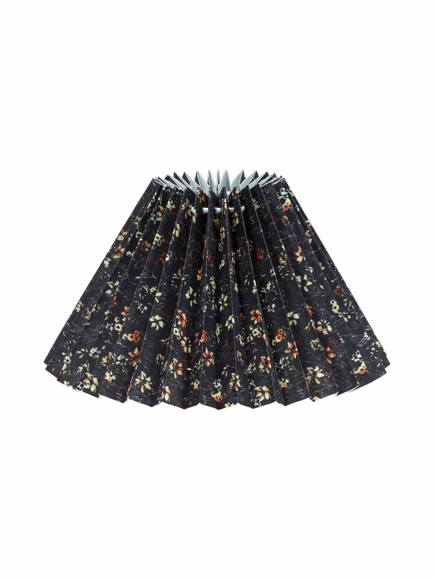 Ines veckad lampskärm med ett småblommigt mönstrat tyg på mörk botten. Formen är lätt utställd och har en vit insida som ger ett vackert sken när lampan är tänd. Det blommiga tyget är gjort i 100% ekologisk bomull. E27 ringfäste som sitter 5cm från botten. Det smarta vändbara ringfästet gör att skärmen kan användas både till lampfötter och takupphäng eller läslampor. Diameter upptill 10cm, diameter nedtill 25cm, höjd 14cm.