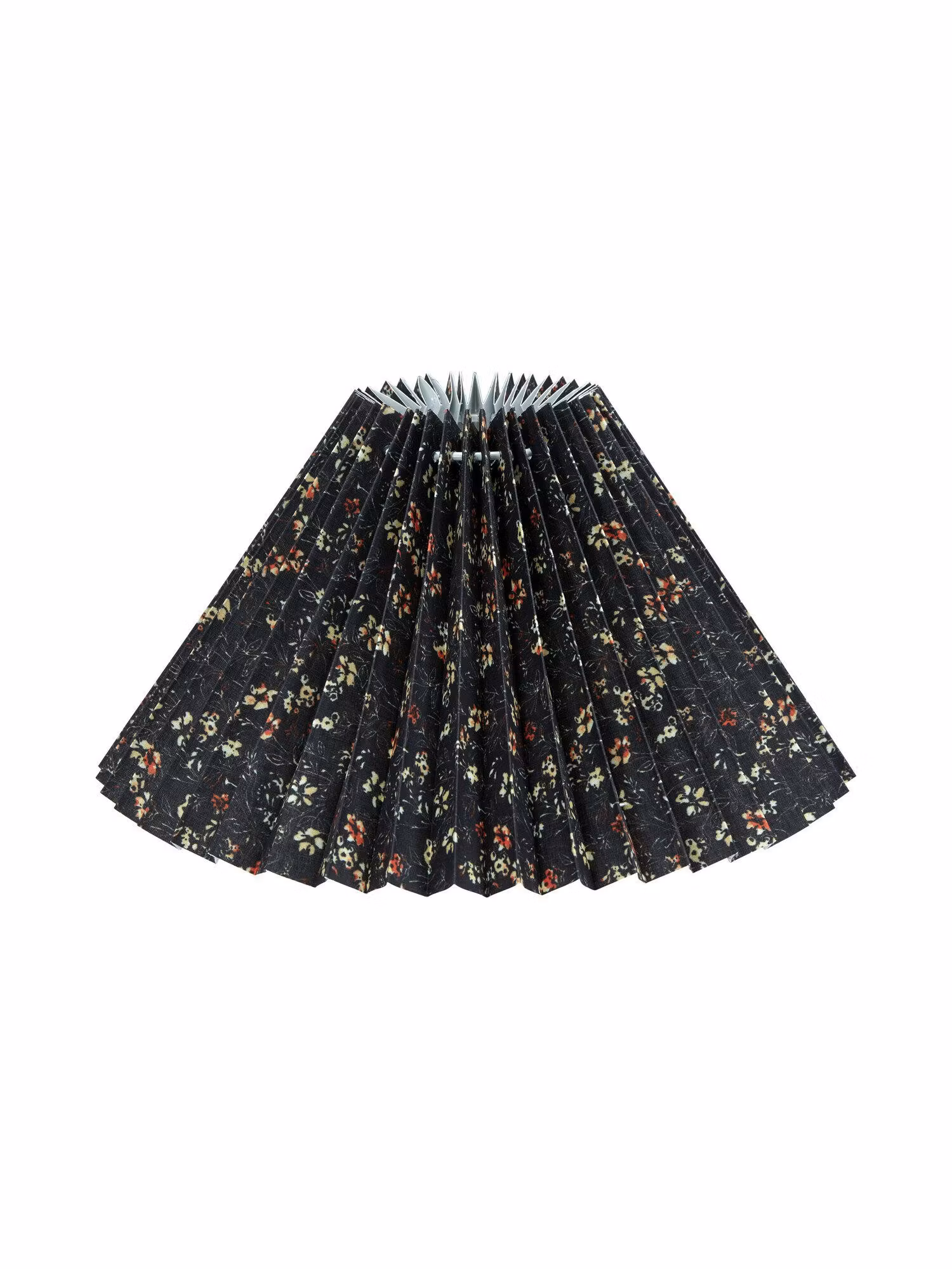 Ines veckad lampskärm med ett småblommigt mönstrat tyg på mörk botten. Formen är lätt utställd och har en vit insida som ger ett vackert sken när lampan är tänd. Det blommiga tyget är gjort i 100% ekologisk bomull. E27 ringfäste som sitter 5cm från botten. Det smarta vändbara ringfästet gör att skärmen kan användas både till lampfötter och takupphäng eller läslampor. Diameter upptill 11cm, diameter nedtill 30cm, höjd 17cm.