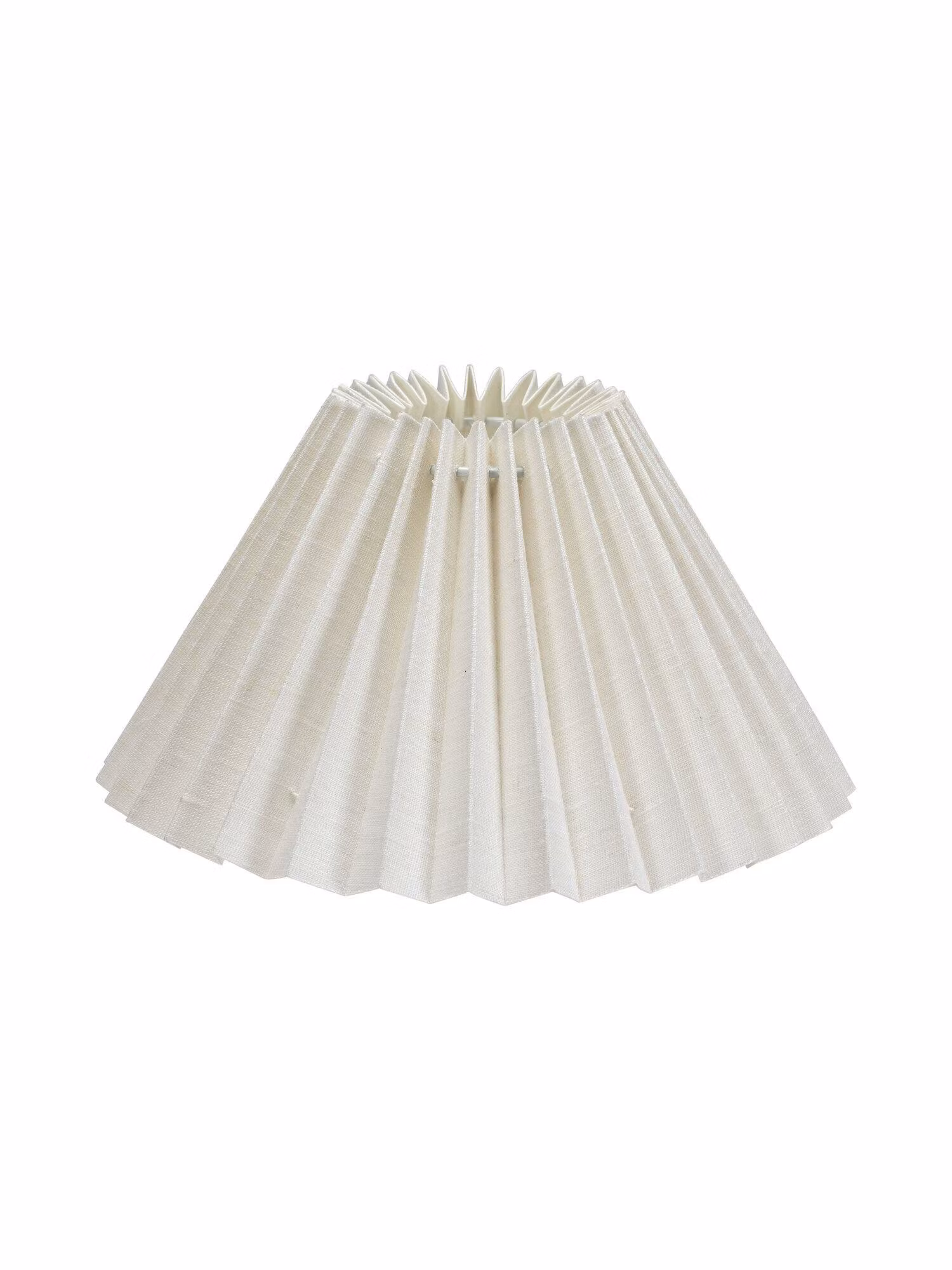 Ines veckad lampskärm med linnetyg. Formen är lätt utställd och har en vit insida som ger ett vackert sken när lampan är tänd. Offwhite 100% linne. E27 ringfäste som sitter 5cm från botten. Det smarta vändbara ringfästet gör att skärmen kan användas både till lampfötter och takupphäng eller läslampor. Diameter upptill 10cm, diameter nedtill 25cm, höjd 14cm.