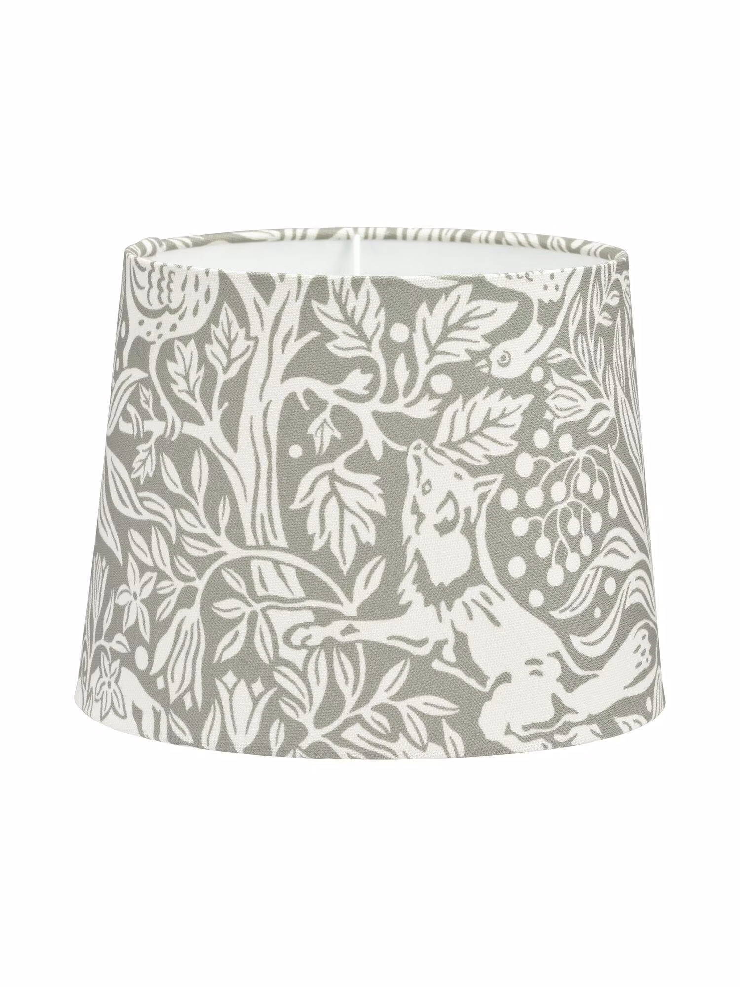 Lampskärm med mönstret Under the Elder Tree i lugn och rogivande grågrön färg från Boråstapeter. Fläderns täta lövverk ger ett vackert, enhetligt mönster på håll och med härliga detaljer från skogens rike vid en närmare titt.