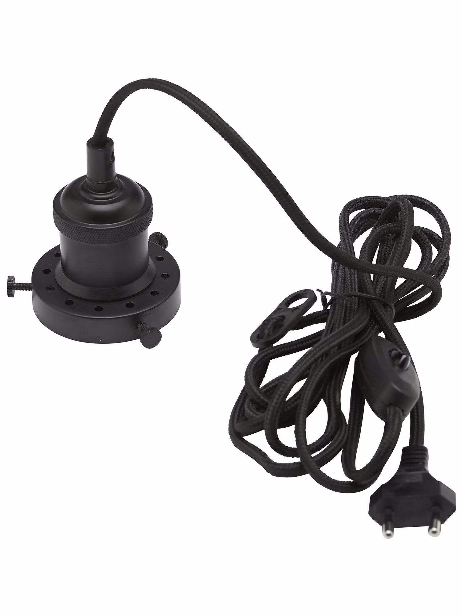 Siri takupphäng i matt svart metall. 3m svart textilkabel med strömbrytare och väggkontakt. Skärm, ljuskälla och takkontakt ingår ej. Välj skärm August som finns i flera varianter eller Elly i svart metall.