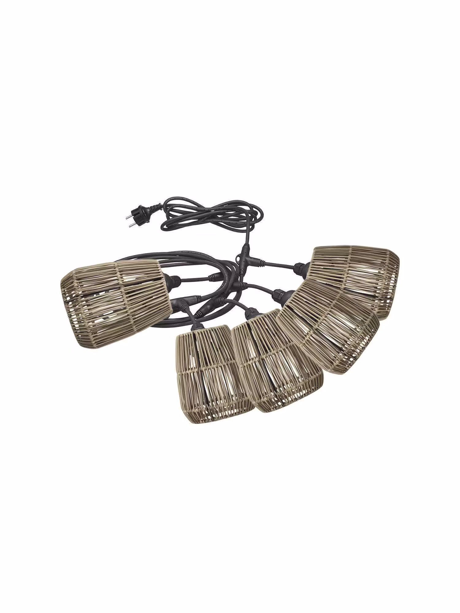 Flex Out ljusslinga för utomhusbruk (IP44) med 5 st lamphållare. Totallängd 6,5 m, 2,5 m till första lamphållaren, sedan 80 cm mellan varje lamphållare. 15 cm från T-koppling ner till skärmring. Slingan kommer i hop med 5 st Saigon lampskärm i konstrotting. Skärmen är 18 cm bred och 20 cm hög.
