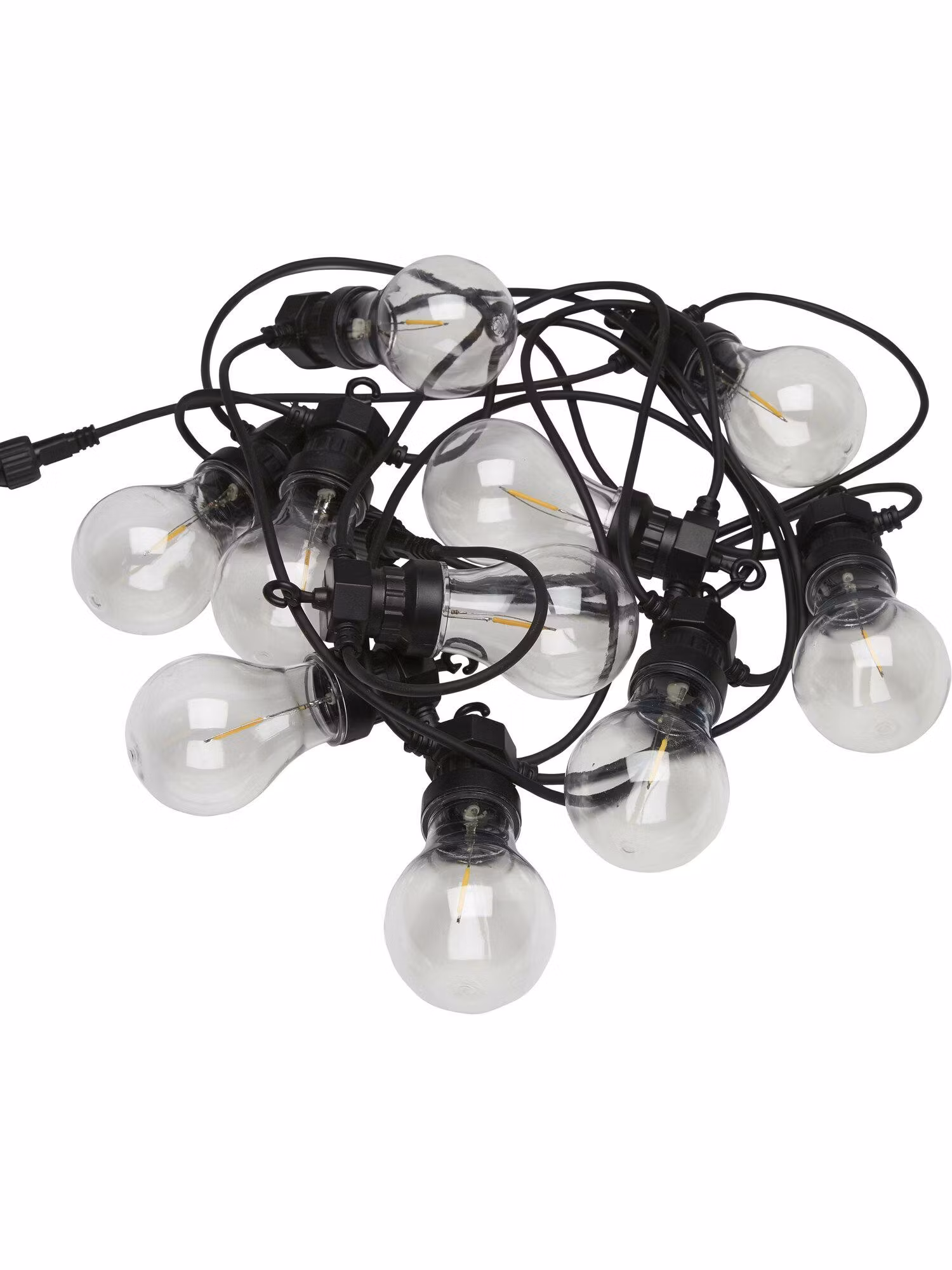 Glow ljusslinga, skapa stämning inomhus, på din uteplats eller balkong. Svart ljusslinga med 10st, fasta ej utbytbara, lampor i klart plastglas (PET). Lamporna ger ett varmvitt sken, 2700K. 40 lumen. Lamphållarna har en liten krok längst upp som du kan använda till att hänga upp i tex en lina. Ljusslingan är 8,7m lång och det är 4m till första lampan, därefter 0,5m mellan varje samt en liten kort svans vid sista lampan. IP44 för inom- eller utomhusbruk. Denna lågvoltsslinga har en rund tunnare kabel och transformator. Totala längden är 8,7m. Går ej att bygga på fler slingor.