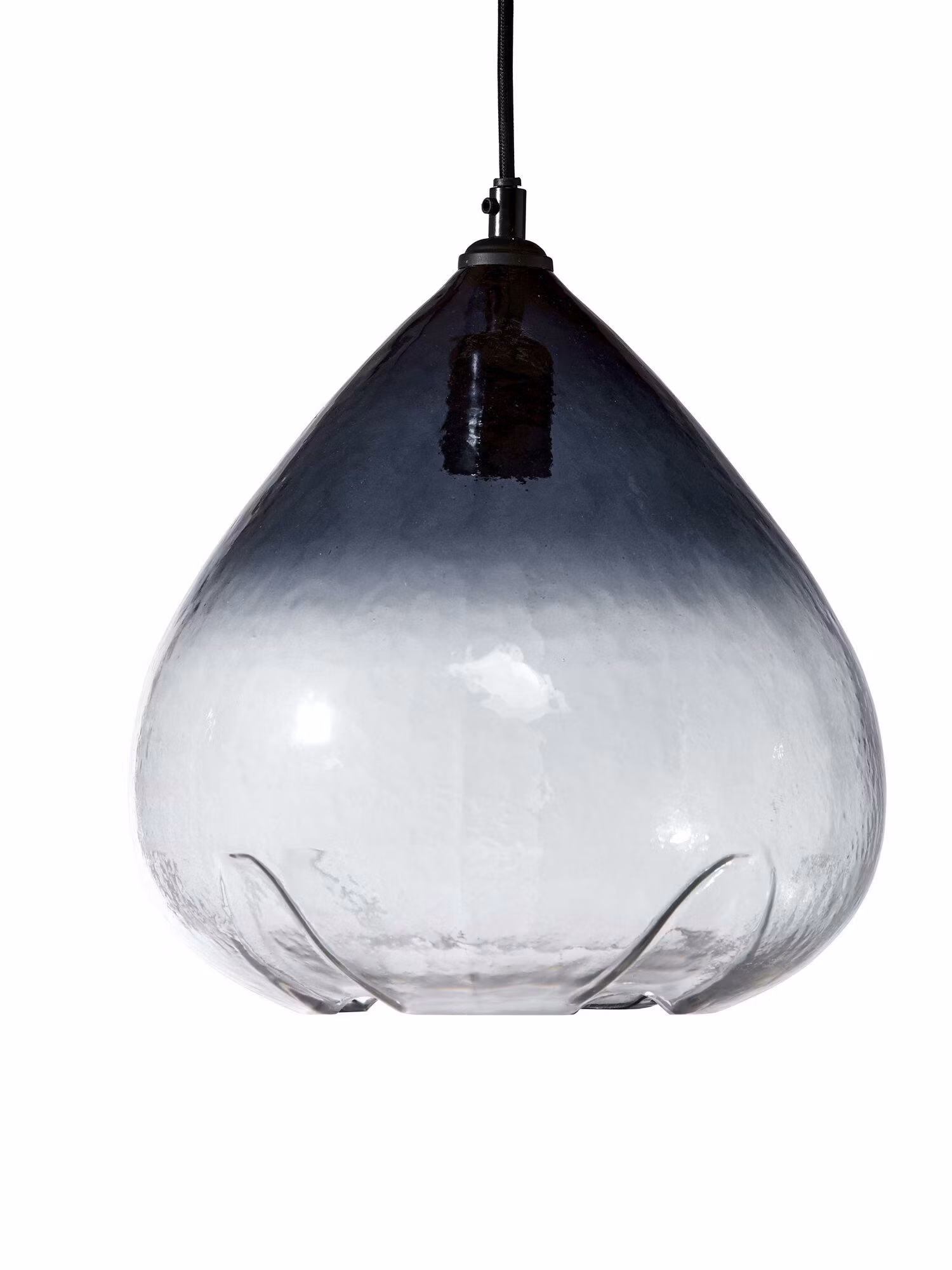 Dana Taklampa i handgjort klarglas. Glaset har en svart ombré effekt från toppen som tonar över till klarglas. Lampan är droppformad med en nederkant som är ihopdragen. Det handgjorda glaset kan ha små ojämnheter vilket gör att ljuset reflekteras fint. Passar lika fint ovanför köksbänken som över matbordet och soffbordet. Höjd 32 cm och diameter 29 cm. Metalldetaljer i matt svart och en 1,5 meter lång svart textilsladd med en svart takkopp. E27 sockel, max 40W. Ljuskälla och takkontakt köpes separat.