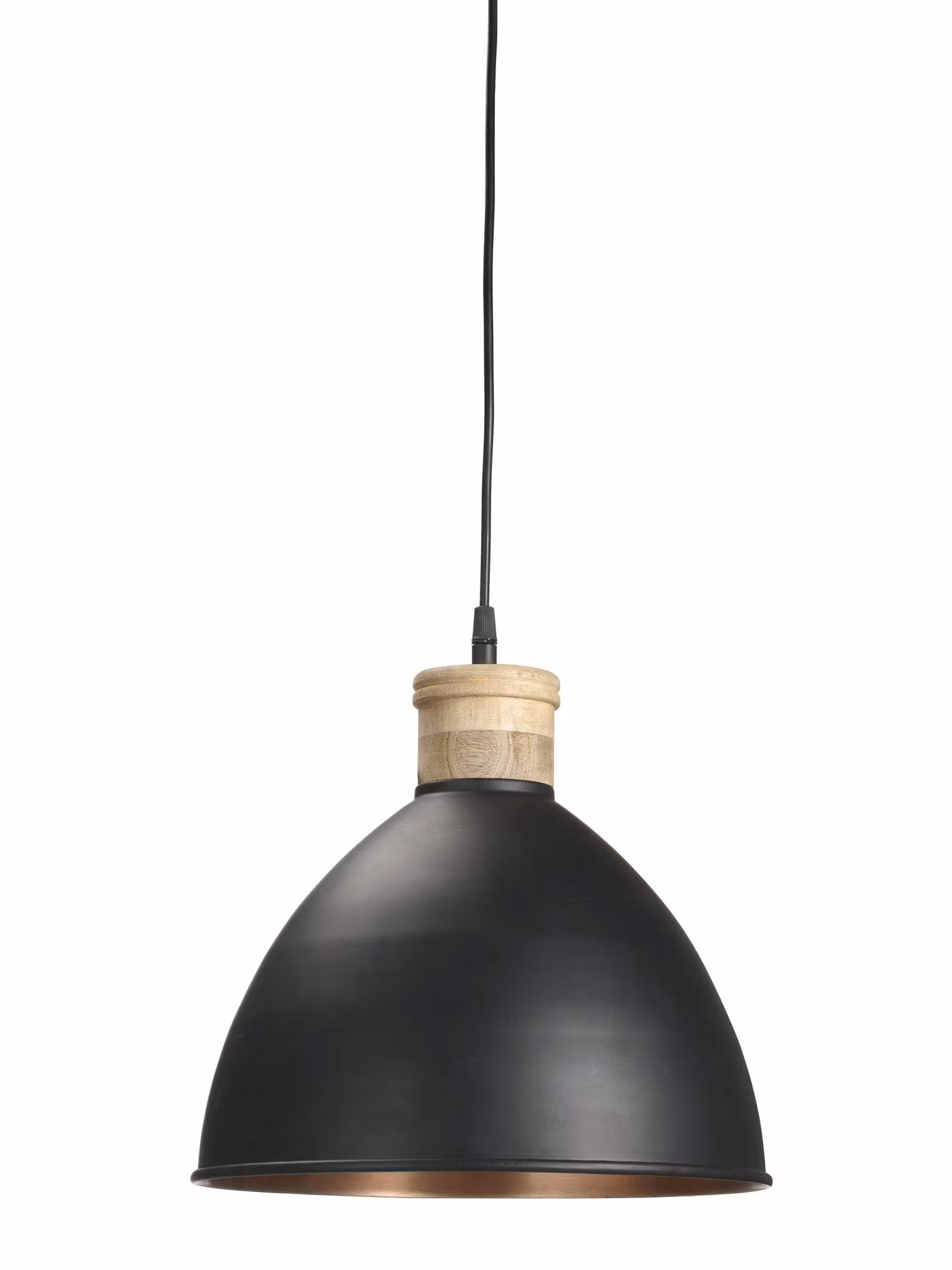 Taklampa Roseville är en snygg och stilren taklampa i industriell design i metall med detaljer i mango trä. Taklampan har en 1,6 meter lång sladd med takkopp i samma färg som lampan. E27 sockel. Max 40W. IP20. Höjd 31cm, diameter 32cm. Lampan är matt svart med kopparfärgade insida. Ljuskälla och takkontakt ingår ej.