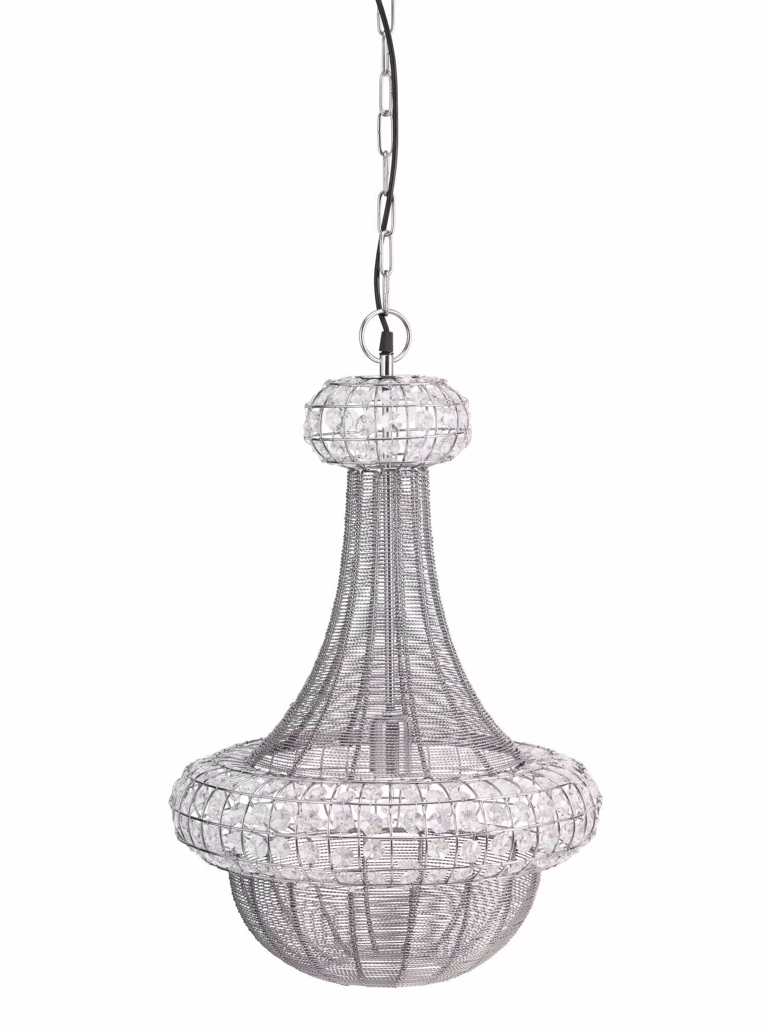 Taklampa Saba i tvinnad metalltråd och detaljer med diamant slipade glaspärlor. En modern variant av klassisk takkrona. Diameter 42cm och höjd 66cm. Silver finish. E27 sockel. Max 40W. IP20. 80cm kedja med takkopp i samma färg för krokupphäng. Takkontakt och ljuskälla ingår ej.