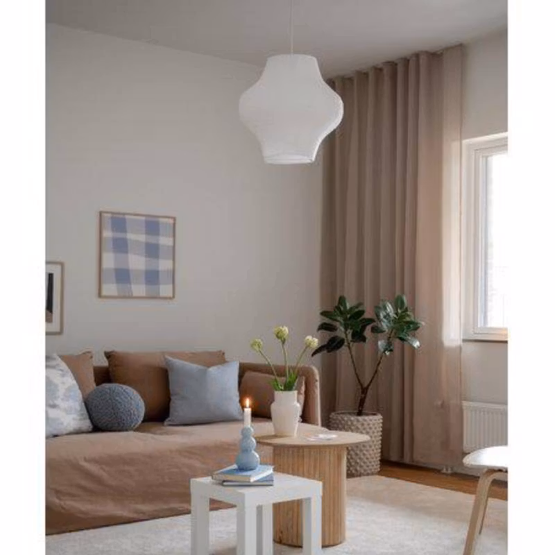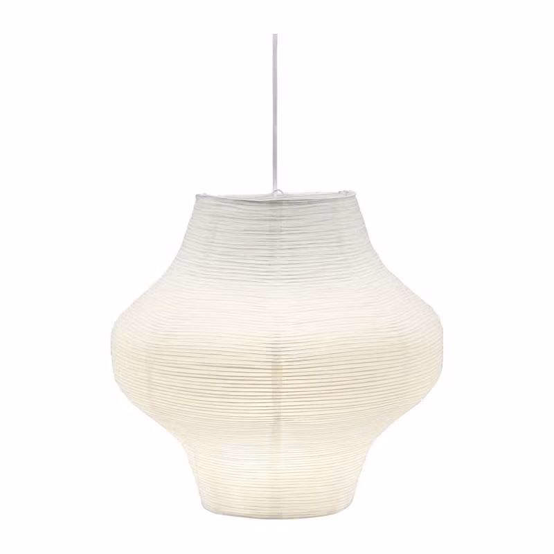 Rispappersskärm Sani med tät oregelbunden metalltråd som skapar ett vackert mönster. Sani är kalebass formad 44,5cm i diameter och höjd 42,5cm. Levereras utan lampsladd. Spänns ut till sin form med hjälp av en metallexpander som man även fäster lampsladden i.