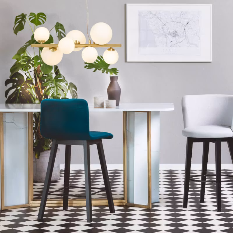 MOLEKYL modern snygg taklampa i matt mässing med 7 vita glaskupor i två olika storlekar. Hänger i två justerbara vajrar. Krokupphäng med takkopp i matt mässing.