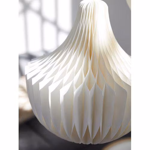 Vicky, vacker handgjord pappersskärm i ett vitt kraftigt FSC-märkt papper. Origamitekniken är ett gammalt konsthantverk från Asien. Denna skärmen har en klassisk ljuskronsform och ger ett vackert sken när den är tänd. Höjd 40cm, diameter 40cm. Levereras platt tillsammans med ett skydd för ljuskällan och monteringsanvisning. Viks ut och fästs ihop med hjälp av snäppmagneter. Enklast är att först hänga upp lampsladd och sedan vika ut och fästa ihop skärmen. Lampsladd (E14) och ljuskälla ingår ej, köps separat. Använd max 3W LED ljuskälla.