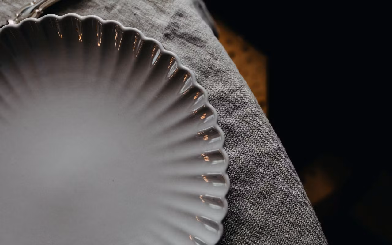 Flora-serien erbjuder sex stilrena delar: mattallrik, assiett, djup mattallrik, två olika skålar och ett uppläggningsfat.