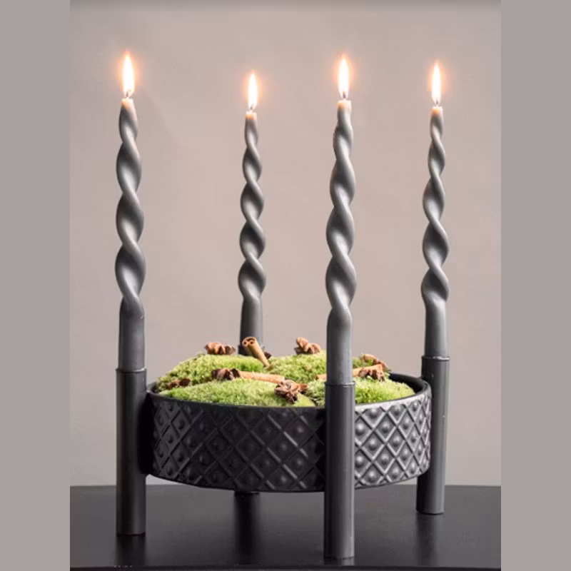 Rund Adventsljusstake i svartlackerad aluminium med plats för fyra ljus och dekoration.