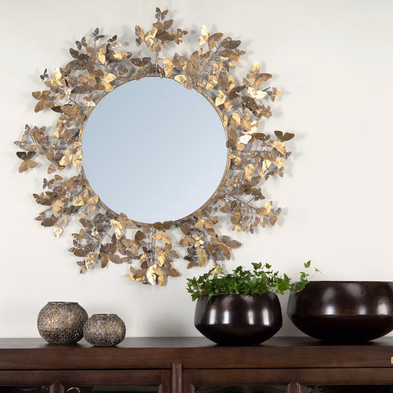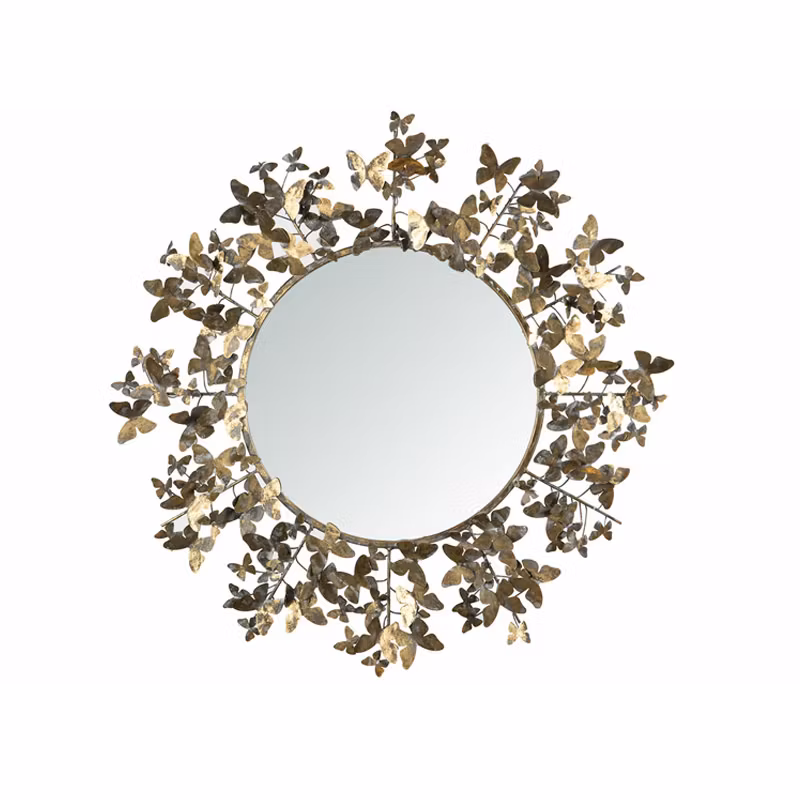 En spegel som ger en exklusiv och unik touch till ditt hem! Spegel Fjäril G.Brun är en stilren och elegant spegel som ger en modern och sofistikerad känsla till ditt hem. Den är tillverkad i både guld- och bronsfärgade metaller och har en fjärilsformad ram som ger en unik look. Det är en perfekt spegel för att lägga till en lyxig och glamorös känsla till din inredning. Med sina 80 cm i diameter och 5 cm tjock, kommer spegeln att se imponerande ut på väggen.