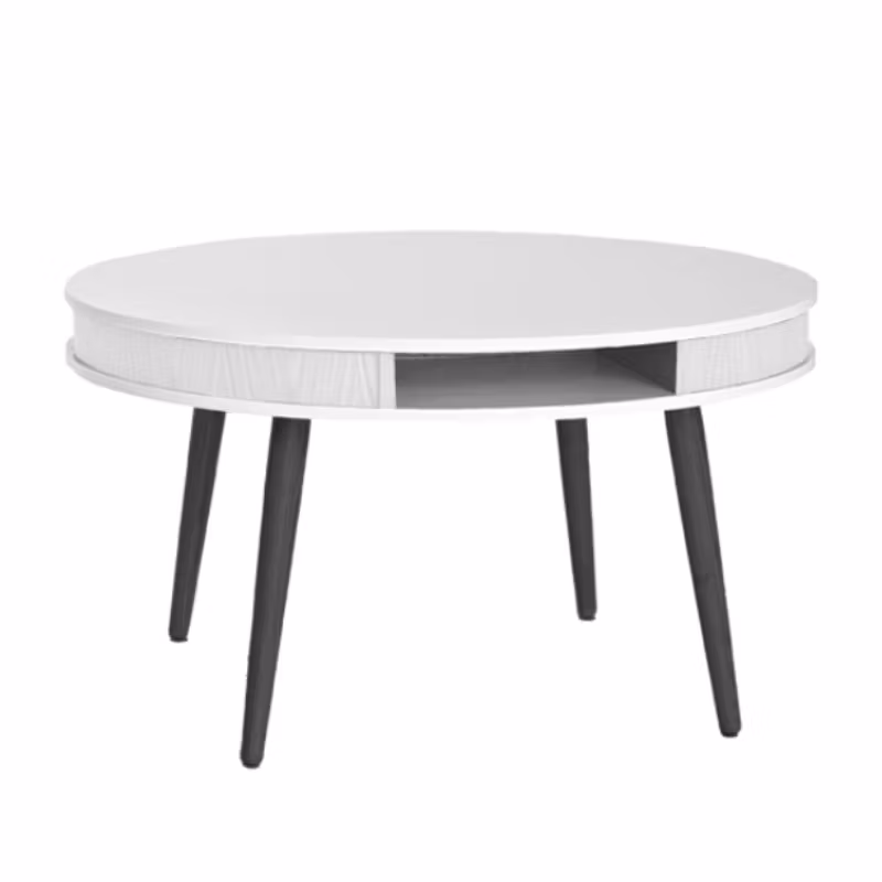 Hugo Soffbord Rund i Vit/Vit med svarta ben är ett elegant och minimalistiskt soffbord som passar perfekt i moderna hem. Bordsskivan är tillverkad i slitstark MDF och fanér och har en ren vit yta som skapar ett luftigt intryck. De svarta benen ger en snygg kontrast och tillför en sofistikerad och trendig touch till bordet.