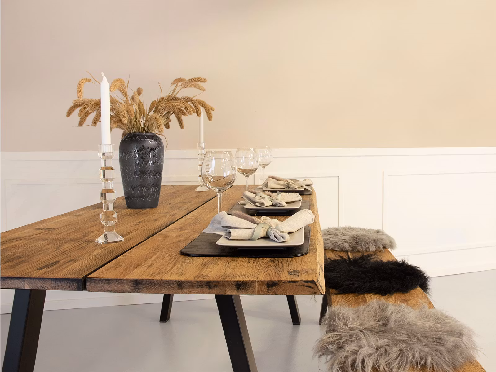 Därför kan även utseendet variera, då träet som används till denna serie har många knoppar och strukturer som ger liv åt bordsskivan.