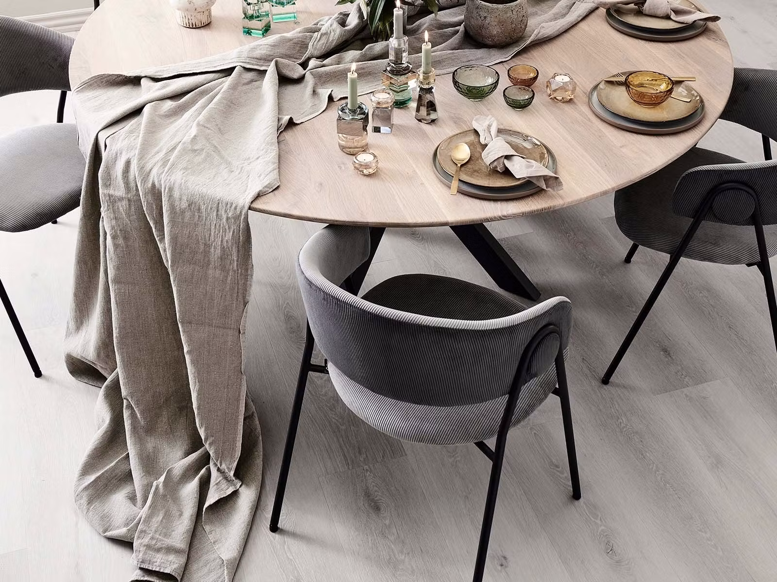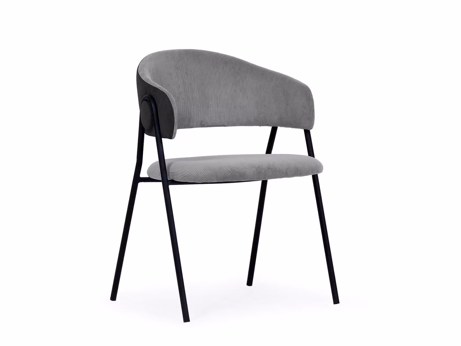 Fin Lina matstol med rund rygg i ljusgrå och svart färg på baksidan av ryggen.