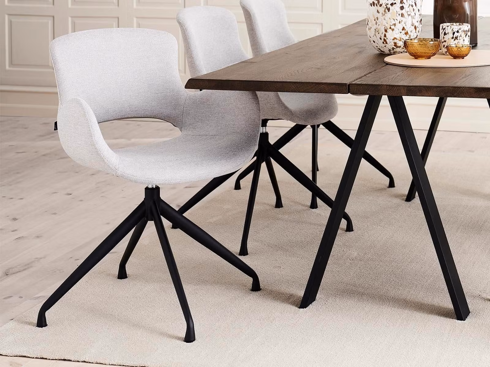 Den vackra matstolen Luna är gjord av ljusgrå larbenetyg med en vridbar svart pulverlackerad ben. Den eleganta stolen kan användas i matsalen, kontoret eller mötesrummet.