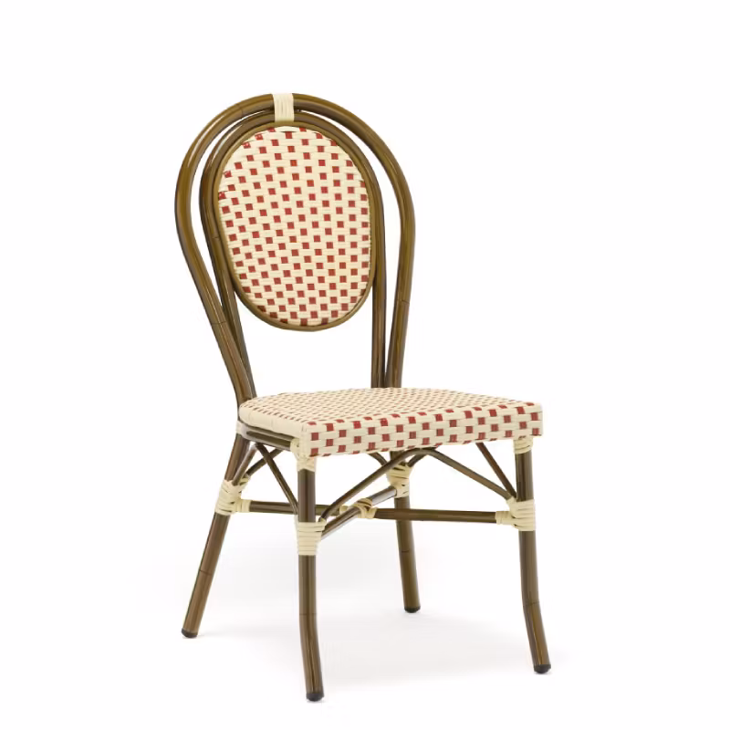 Utomhusstol i Fransk stil med stomme i kraftig aluminium och bambu-look. Den är tillverkad för intensiv användning och rekommenderas för utomhusbruk.. Tack vare sin tillverkning i konstrotting har dessa utomhusstolar en stilren och klassisk design som också är lätt att rengöra och tålig mot varierande väderförhållanden.