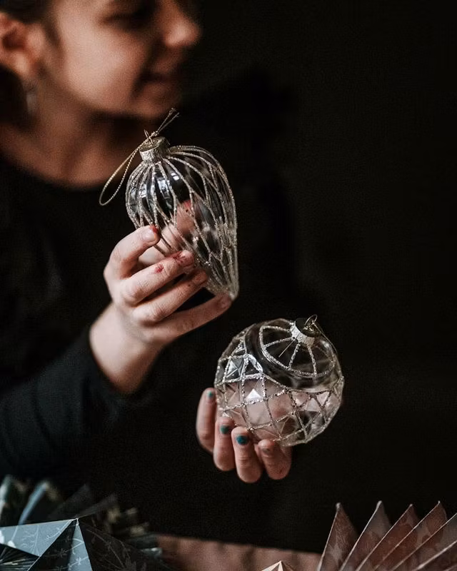 Genomskinliga julgranskulor med glitterdetaljer. Perfekta för att klä julgranen. Tillverkade av glas.